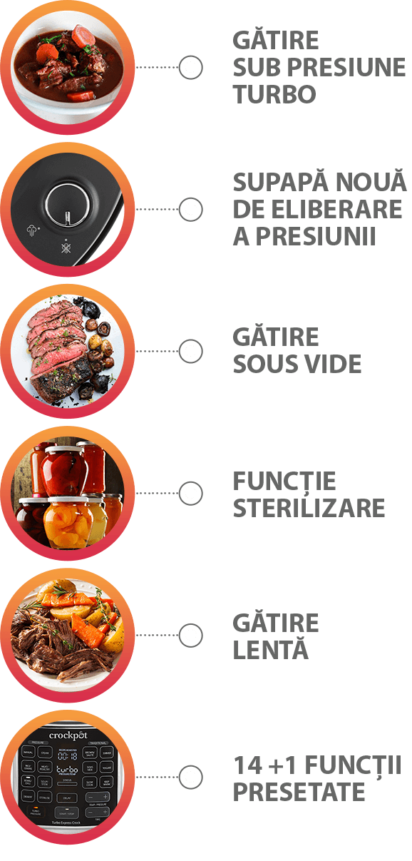 Gătești rețetele preferate rapid și confortabil! Friptură, supă, pește, legume sau desert, totul este gata mult mai rapid cu funcțiile presetate și Modul Turbo de gătire sub presiune!