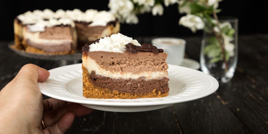 - Dupa ce ai omogenizat compozitia, torna-o peste stratul de ciocolata neagra. Pune iar tava in frigider pana ce topesti si ciocolata cu lapte. Toarn-o peste crema de branza, adauga 15 g faina, omogenizeaza si adaug-o peste ciocolata alba.