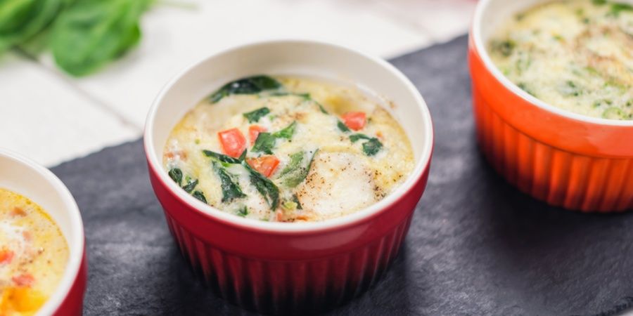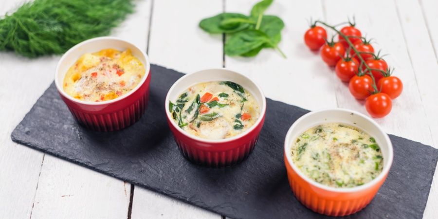 - In al doilea ramekin pune cubulete de cheddar, de sunca si ardei gras.